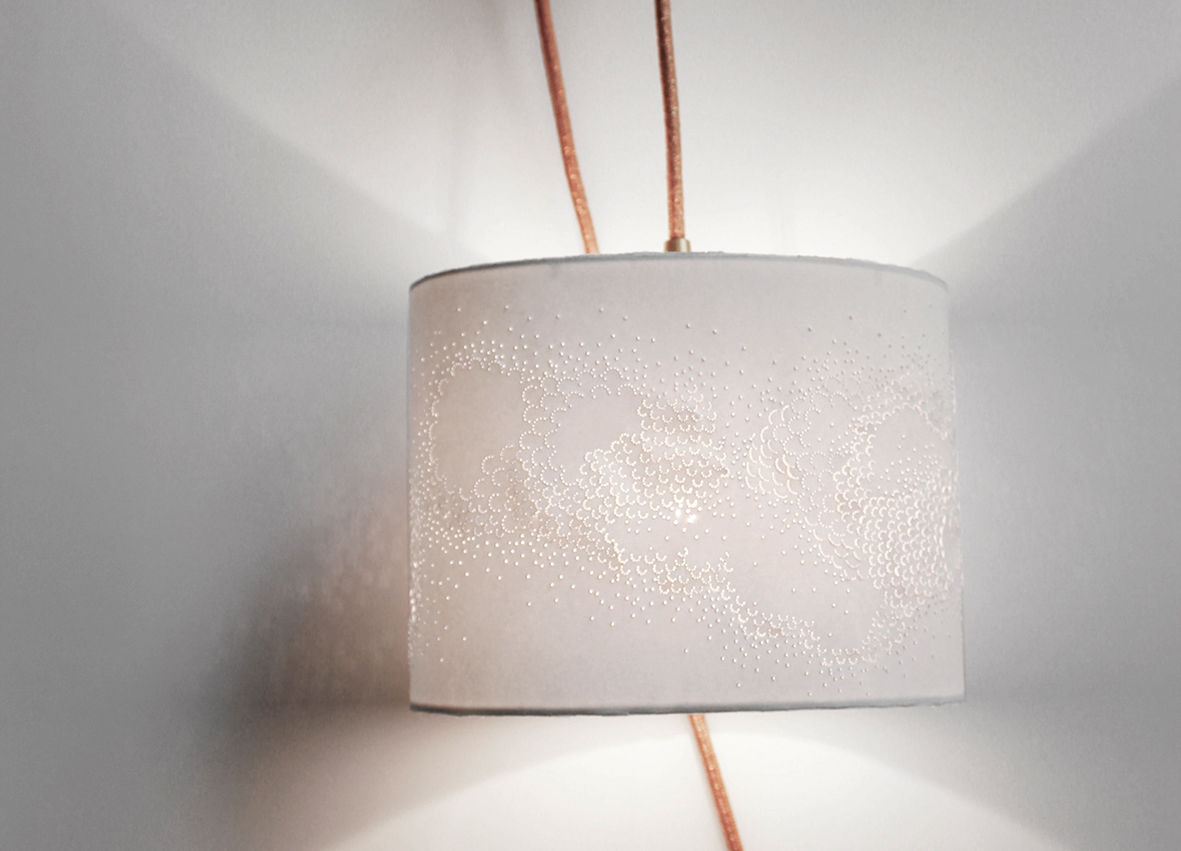 Confrontation du lisse et du granuleux sur un même linéaire. Une nuée de petites perforations, qui jouent sur l'élasticité du papier, puis créent un relief. Se dessine alors une trame en volume, un graphisme unique, poinçonné sur l'instant selon le déplacement de la main sur le papier. Une errance maîtrisée de pointillés, d'écailles.